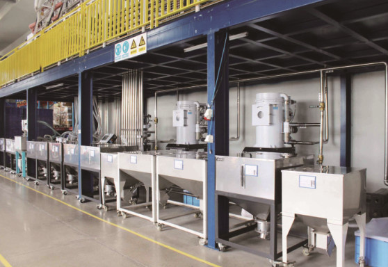 整套中央供料系統配備12台儲料桶(原料就在此處投放),4組一對三除濕乾燥模組化組合,配備4台(3用1備)魯式風機和4台中央過濾器,與此同時設計有24組1出2分歧管兩兩疊放組裝的原料分配站,分配站整體結構小巧、精緻,佔用空間小,方便客戶操作切換原料。為了減少占地面積及方便佈局,將整個原料房設計為兩層,下層為原料輸送及分配層,上層為原料乾燥層。
