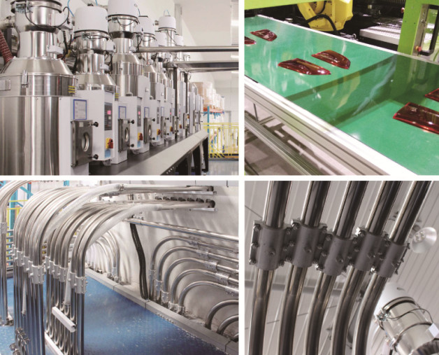 縱覽整個車間的管路佈局,分三層有序排列,從供料房的儲料桶到模組化除濕乾燥組合再到原料分配站最後到車間注塑機,相關管路佈置得當、整潔,毫無贅餘。