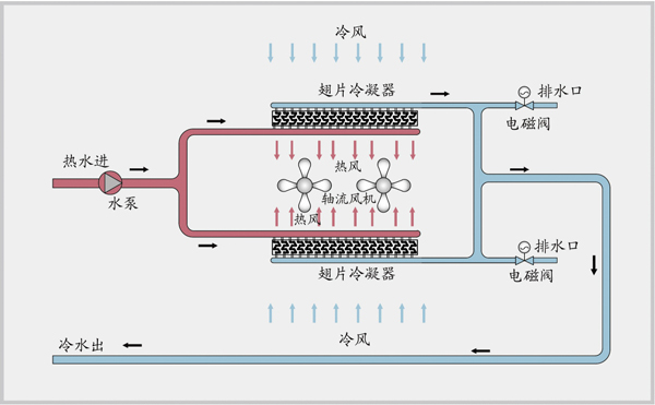 环境空气由轴流风机带动,对翅片式冷凝器进行冷却,高压水从主管路经水流分布器一分为二,分别进入翅片式冷凝器,再由水流分布器合二为一流入主管路。轴流风机抽风对高温水进行冷却。