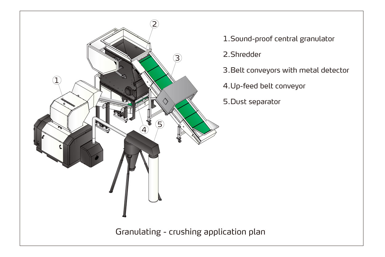The subject of this exhibit was a circular economy and sustainable development, which certainly included our granulating and recycling program. Its comprehensive solutions achieve full coverage from granulating besides machines to sound-proof centralized granulating. The collaboration between shredder and granulator can realize coarse and fine granulating of large plastic parts, to improve the recycling efficiency and eliminate the manual cutting of the plastic parts.