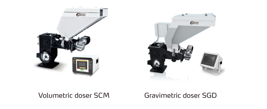Plastic products after molding usually show a variety of different colors, so how to accurately add color masterbatch is significant in the molding process. According to different requirements, Shini can provide various dosing devices to metering the dose of masterbatch accurately. Such as the SGD gravimetric doser and SCM volumetric doser exhibit at the K2019. SCM adopts a precision-machined dosing screw to realize the accurate metering of masterbatch. The easy modular structure allows quick assembly and disassembles during the change of masterbatch without any tools.SGD implemented additional loss-in-weight technologies based on SCM dosing principle. It continually monitors dosing throughput and corrects the dosing for the finest dosing precision. SGD can offer user-friendly experience with an intuitive screen. The operator can monitor the real-time output of the masterbatch, and simple parameter settings make it easy for the operator to use the device. These two products equip standard RS485 or Ethernet interface, and support Modbus-RTU or Modbus-TCP protocol. The protocol is to interconnect between devices, so that is can achieve centralized monitoring, data logging and analysis, and traceability of process parameters in the production.