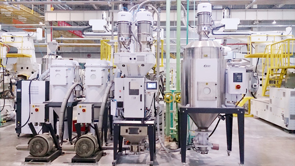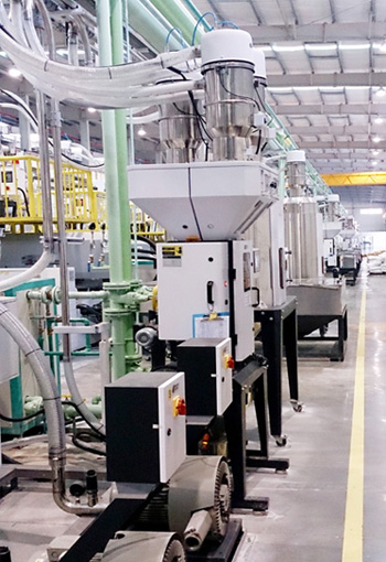 Washing machine workshop divided into areas and adopts central conveying design. It has 7 conveying areas. As material feeding is in desperation state, and machine between in large distance, if only takes the central conveying method, it is not scientific and would waste lots of pipe accessories, which loses the advantages of central conveying. The 7 conveying areas all equipped with gravimetric blenders and need to process the proportional mixing for material and masterbatch, then convey the mixture to the dryer for drying, therefore, it ensures the product’s molding quality. The IMM also equipped with mixer and machine-mount dryer which possess the function as second mixing and drying. It prevents delamination of material and masterbatch, prevents moisture regain that may influence product quality. At the same time, each area equipped with independent air pump for no mutual impact and ensuring system stability.