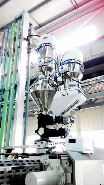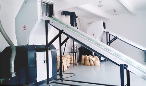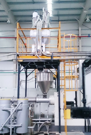 It was inevitable to have rejects and sprue in the production, so the system was considered to use central granulating method. The crushed granules centrally conveyed to the material appointed storage hopper.