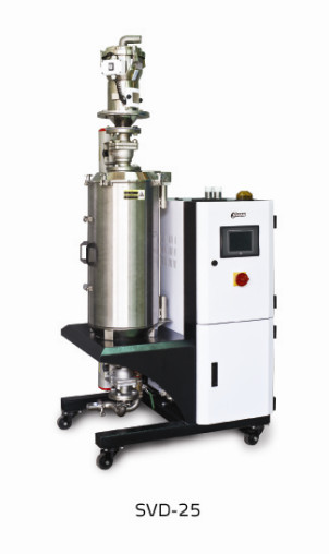 信易新產品除濕乾燥設備SVD真空乾燥機,具備除濕乾燥送料三合一功能,可以實現對塑膠原料的有效除濕乾燥。其除濕乾燥工作方式為,真空泵對乾燥料桶內部抽真空,並保證乾燥料桶的真空度始終維持在設定的範圍內,從而使物料內部的水分在壓力差的作用下擴散至物料表面,與此同時加熱系統通過熱傳導對被乾燥物料持續加熱,水分子在物料表面獲得足夠的熱能與動能,在克服分子間的相互吸引力後,被真空泵抽走,從而實現塑膠原料的除濕乾燥。