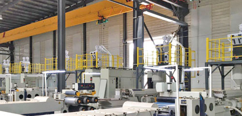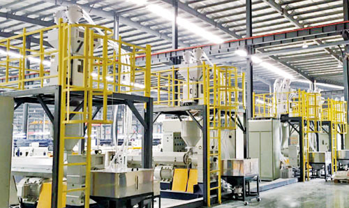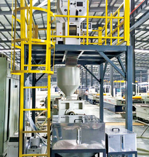 該公司的一項主營業務為生產遮陽布。遮陽布的用料為膠絲,而膠絲由擠出機擠出而成。該系列產品主要用於出口,故對產品嚴苛要求,其織布機均為進口品牌,共有15條拉絲機生產線,用於生產扁絲及圓絲,初期產品使用兩組分,分別為原料及色母,色母的添加比例為4~6%。在與客戶進行了深入溝通探討之後,我們建議客戶每條拉絲線配備一台SGB-600-4秤重式拌料混合機,實現對兩種組份精確比例混合。