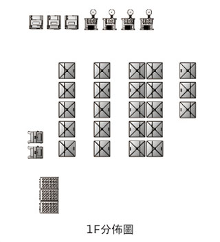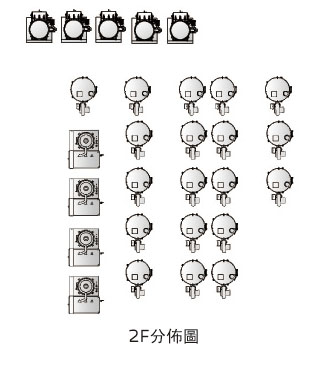 二層佈局與一層相似,只是正上方佈置5台中央過濾器SCSF-200F-E。在儲料桶的正上方,則直接於平臺上安裝有19台料斗乾燥機與4台除濕乾燥機。容量從100kg到500kg不等,按客戶要求乾燥相對應的原料。而在一層原料分配站的正上方則開有一個約長2.3米,寬1.1米的方孔,用於走管道至車間注塑機台。