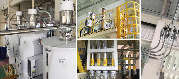 該客戶供料系統共規劃1台注塑機的中央供料,輸送能力為:800kg/hr,配備三種原料乾燥,另備用一根料管輸送未乾燥原料。為了確保輸送能力,採用1台吸料機SAL-5HP-UG124對3台乾燥機料斗SHR-24U-S進行吸料;1台吸料機SAL-10HP-UG對1台注塑機料斗SHR-36U進行吸料。由於每次只使用一種原料,該方案料管從注塑機料斗出來後採用一出四通管道分別接連四種原料,同時在每條管道上配備一個氣動關料閥,當選擇一種原料時,該原料管道上的氣動關料閥自動打開,原料可以從該管道輸送到注塑機機臺上,另外三條管道上的氣動關料閥則處於關閉狀態,選其他三種原料時亦然。