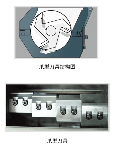 爪型刀具一般採用錯刀式布局,階梯形分布,其與定刀片間的切角角度大,故同時參與粉碎的刀片數量較少,也即粉碎的阻力較小,因而其比較適合於粉碎板材類型的材料。一般動刀片安裝在刀架上,不需要調整,而定刀片安裝於粉碎室的機架上,可通過調節螺絲實現刀具間隙補償。爪形刀具,業界也稱拋棄式刀具,其比片刀經濟,當長期使用後,可直接更換新的刀具,而不需要重新刃磨使用。使用爪型刀具的粉碎機,主要代表機型有SG-16N、SG-20NC、SG-23及SG-23E,其中SG-16N及SG-20NC主要用於機邊粉碎,而SG-23及SG-23E主要用於集中粉碎。