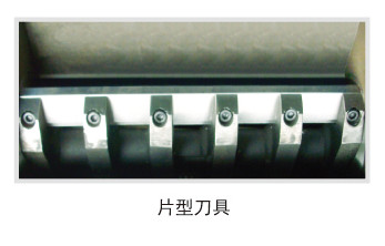 片形刀具采用漸切式設計和V型切割技 術。漸切式的設計結構類似於家用的剪刀,對物料實現逐步粉碎,降低了粉碎阻力,但相較於爪形刀具,其動刀片與定刀片間的切角角度較小,因而其可保證粉碎室的有效粉碎空間更大,更易於抓取物料,所以更適合粉碎大型的空殼類的物料。V型切割技術則主要用於粉碎室尺寸較大的機型,對於這些機型,其粉碎室的長度較長,若每排動刀或定刀使用一片刀片,則刀片的加工成本會提升,使用的便利性下降,故一般將刀片分為兩片,呈現V形排列,此結構可優化刀具的尺寸,並且在粉碎時將物料向中心位置推送,降低粉碎室兩側結構的磨損,提升了粉碎室中間部位的粉碎效率。片刀的定刀一般固定於粉碎室機架上,動刀固定在刀架上隨刀架軸旋轉,其動定刀間隙可以利用調刀架在機外實現間隙調整,方便快捷。使用片形刀具的粉碎機,主要代表機型有SG-30/36/43/50/70及相對應的E系列機型,主要用於對物料實現集中粉碎。