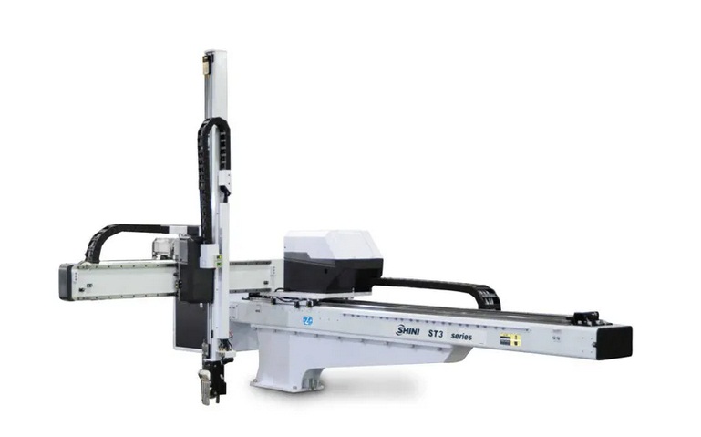 横走式三轴/五轴伺服机械手系列主要用于注塑成型时成品及水口料的取出。分为单截式与双截式供客户选择,以适用于二板模、三板模或热流道模具。符合工业4.0规范,能实现各种特殊动作,如排列、堆放、品检和埋入等。适用于锁模力在3600T以下的射出成型机。