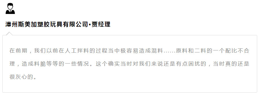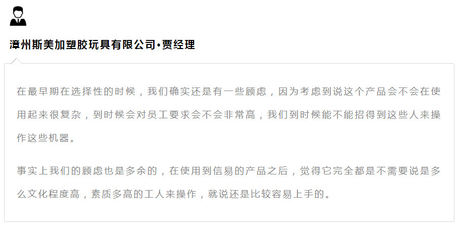 玩具产业是劳动密集型产业,劳动力成本的上升会直接导致玩具生产成本上升,压缩企业的利润空间,从而对玩具生产企业产生不利影响。因此,减少劳动成本、提高生产效率是企业发展的关键点。“现在我们用到信易的这一套产品上了之后,目前我们总共8个人,也就是说从人力成本上确实是节省了很多。”漳州斯美加贾经理说道。