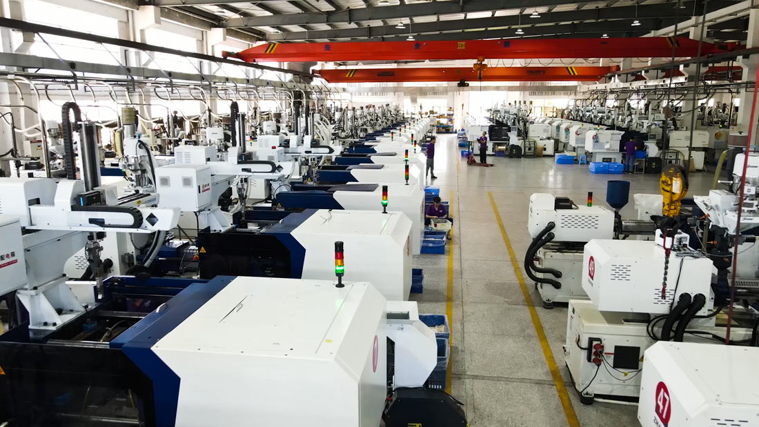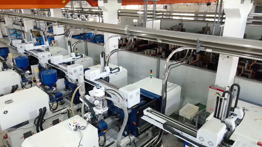 斯美加拥有全自动高性能电动注塑机112台,机台总用料量约1.2T/hr,原料输送的最大水平及垂直距离分别为135m及3.5m。