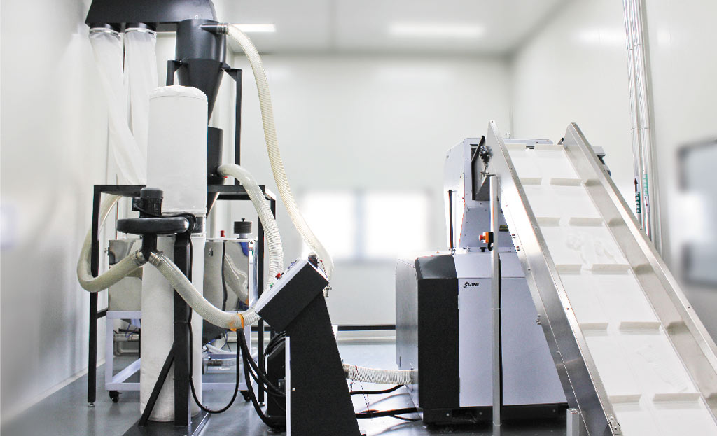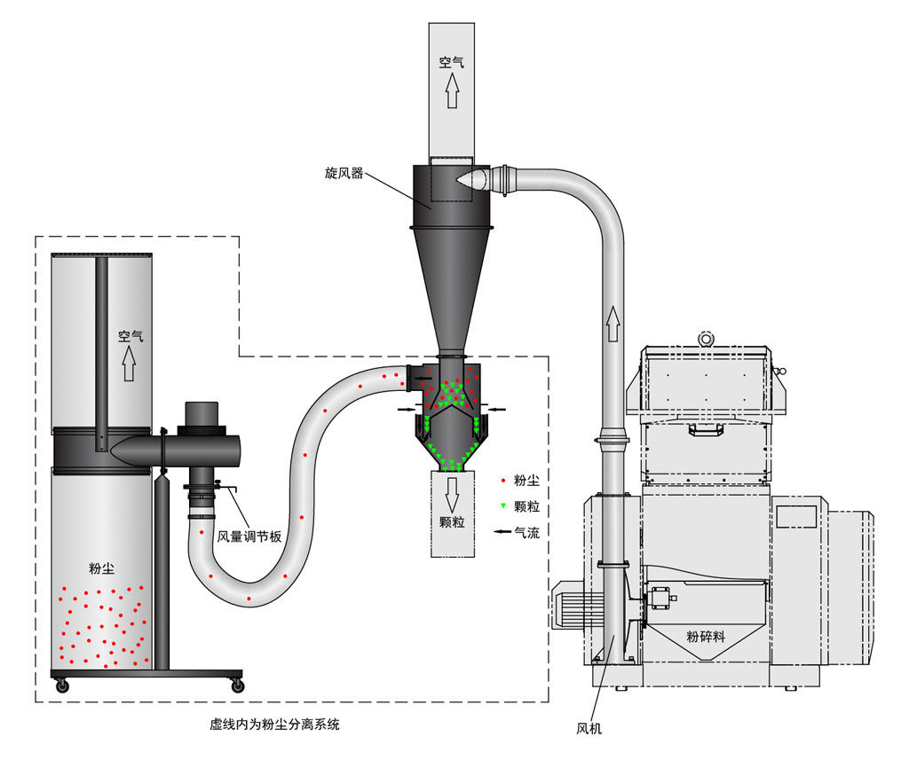 粉尘分离系统配备除尘风机与集尘装置,粉碎料经输送风机送料至旋风器后,落入粉尘分离器桶内,经桶内锥斗把粉碎料往四周分散,除尘风机把粉尘向上吸出,吸至集尘布袋中储存,颗粒从粉尘分离器桶内直接掉落下来。当需要清洁时,只需要用从气流补风口四周和落料口吹入压缩空气就可以把分离桶内部清理干净、维护省时省力。配备风量调节板,可根据需求灵活调节除尘风机风量,适合各种比重塑胶原料的粉尘分离,具备宽广的应用范围。
