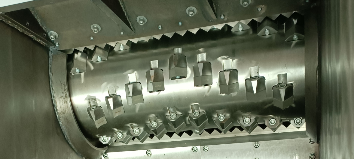 单轴破碎机也叫塑胶撕碎机、单轴撕碎机,是利用动刀刀粒与定刀的相对旋转,铣削式破碎设计,并通过筛网控制出料粒度大小,将物料进行撕碎切小,得到适合的塑胶颗粒,其破碎室刀具结构如下图所示。