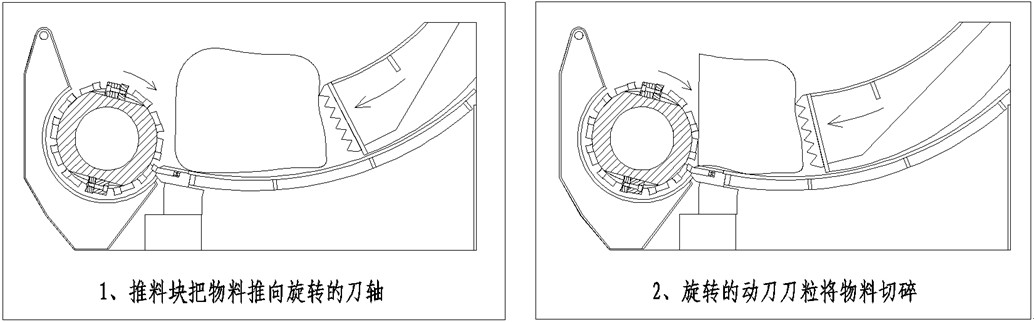 低切点型设计,粉碎室固定刀起始切割点低,使得粉碎室内进料空间很大,材料进入粉碎室后可以被迅速的抓住并切碎。这种粉碎室设计用于粉碎大空心壳体料和框架材料的粉碎,粉碎后可直接得到所需大小的颗粒,其粉碎室结构如下: