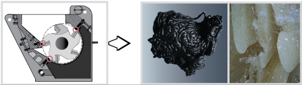 五爪式的半封闭式转子,每行叶片之间的空隙不大,被粉碎原料不会掉入转刀中。加上高切点型设计,粉碎室固定刀起始切割点高,使得粉碎室内进料空间小,这些特性都使得切割作用不会过强,同时使得即使在要求最苛刻的情况下,转子也免受阻塞或出现失速。这种粉碎室的设计适用于粉碎注塑产生的小型胶头料、厚壁物体和厚的板材等粉碎,其粉碎室结构图如下: