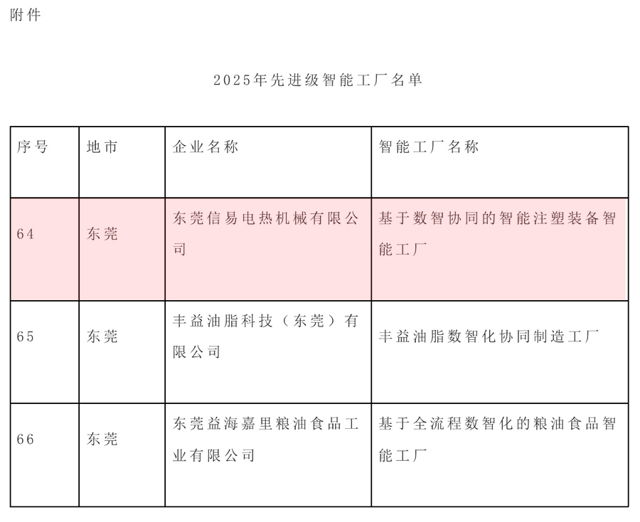 据广东省工业和信息化厅关于2025年先进级智能工厂名单公示,东莞信易荣获“2025年先进级智能工厂”称号。