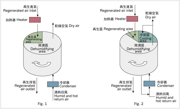 一般除濕方式有冷卻除濕、壓縮除濕和吸附除濕。這裏主要介紹吸附除濕中的轉輪除濕。轉輪除濕機有兩區除濕系統如圖一和三區除濕系統如圖二。兩區除濕系統分為除濕區和再生區,濕空氣經過轉輪除濕區時,空氣中的水分會被轉輪中的吸附介質吸附,空氣變得乾燥供使用;同時,也有另一股高溫氣流通過轉輪再生區,乾燥轉輪,使轉輪能繼續吸附空氣中的水分。這種兩個區的除濕機乾燥風露點溫度≥-20℃,一般適用於空調除濕、倉儲除濕等要求乾燥風露點溫度不是很低的場合。