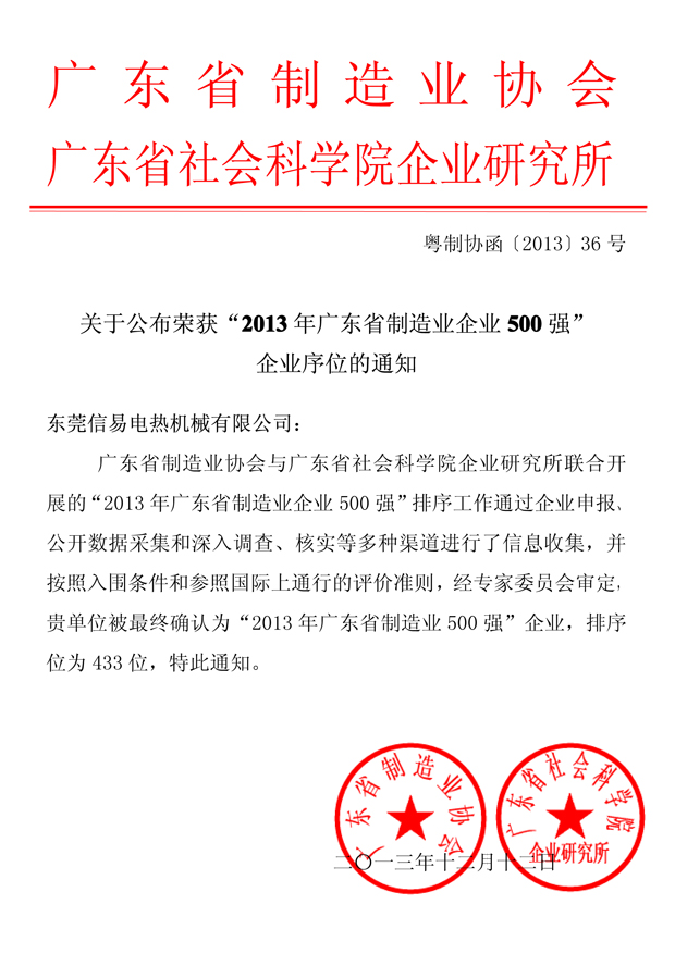 广东省制造业协会与广东省社会科学院企业研究所联合开展的“2013年广东省制造业企业500 强”排序工作通过企业申报、公开数据采集和深入调查、核实等多种渠道进行了信息收集,并按照入围条件和参照国际上通行的评价准则,经专家委员会审定,东莞信易被最终确认为“2013 年广东省制造业500强”企业,排序位为433位。