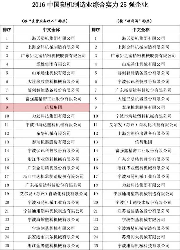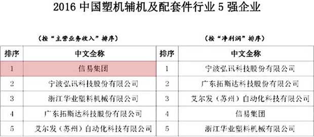 由中国塑料机械工业协会组织的2016中国塑机行业优势企业排序已出炉,经相关部门对参评企业提交资料的审计、核实和公示,并对公示阶段提出的问题进行核对和解答后,确定出“2016中国塑机制造业综合实力25强企业”、“2016中国塑料注射成型机行业15强企业”、“2016中国塑料挤出成型机行业10强企业”、“2016中国塑料中空成型机行业3强企业”和“2016中国塑机辅机及配套件行业5强企业”名单。信易本年度喜获中国塑机辅机5强企业之首。